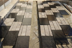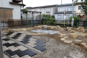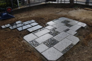 黒御影とレンガで駐車場スペースをつくり車の出し入れがしやすいようにしていきます。